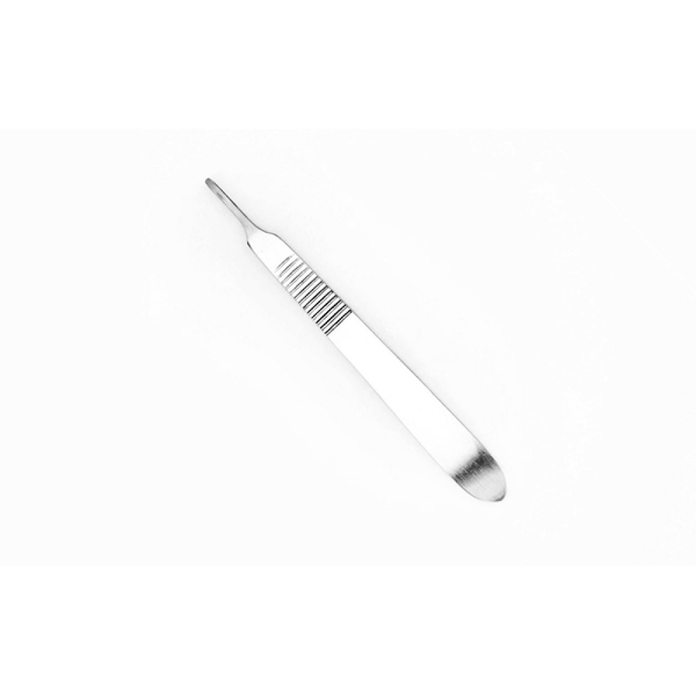 Ручка для скальпеля № 3 малая (120 мм) многоразовая предназначена для крепления одноразовых лезвий с размерами с 10 по 15. Держатель для лезвий изготовлен из нержавеющей стали, что позволяет проводить многократную чистку и стерилизацию изделия. Для удобства на рукоятке проштампован номер держателя лезвий и нанесена противоскользящая насечка