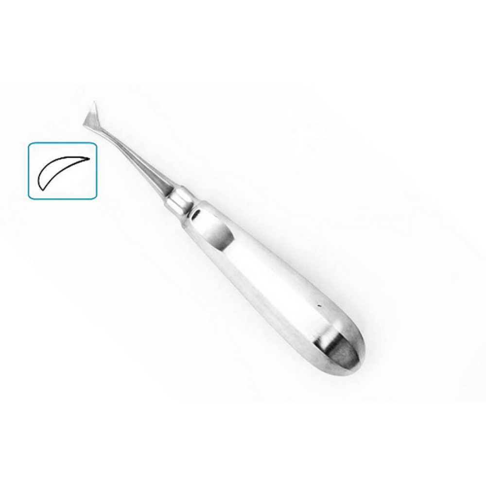 Элеватор зубной угловой, правый флажок под 120 градусов используется для удаления зубов и их корней. Рабочая часть изогнутая.