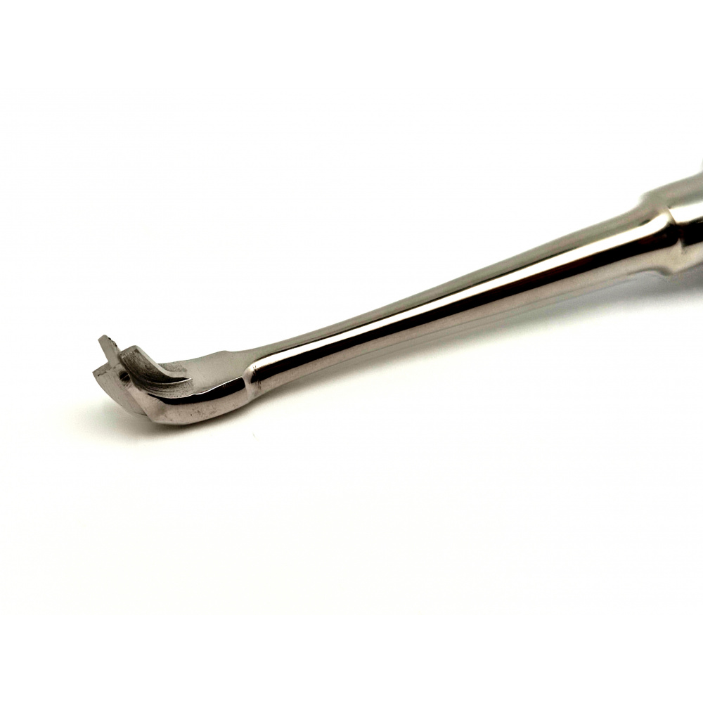 Коронкосниматель ручной: инструмент для снятия с зубов искусственных коронок. Рабоча часть изогнутая, крестообразная. Общая длина 145 мм.