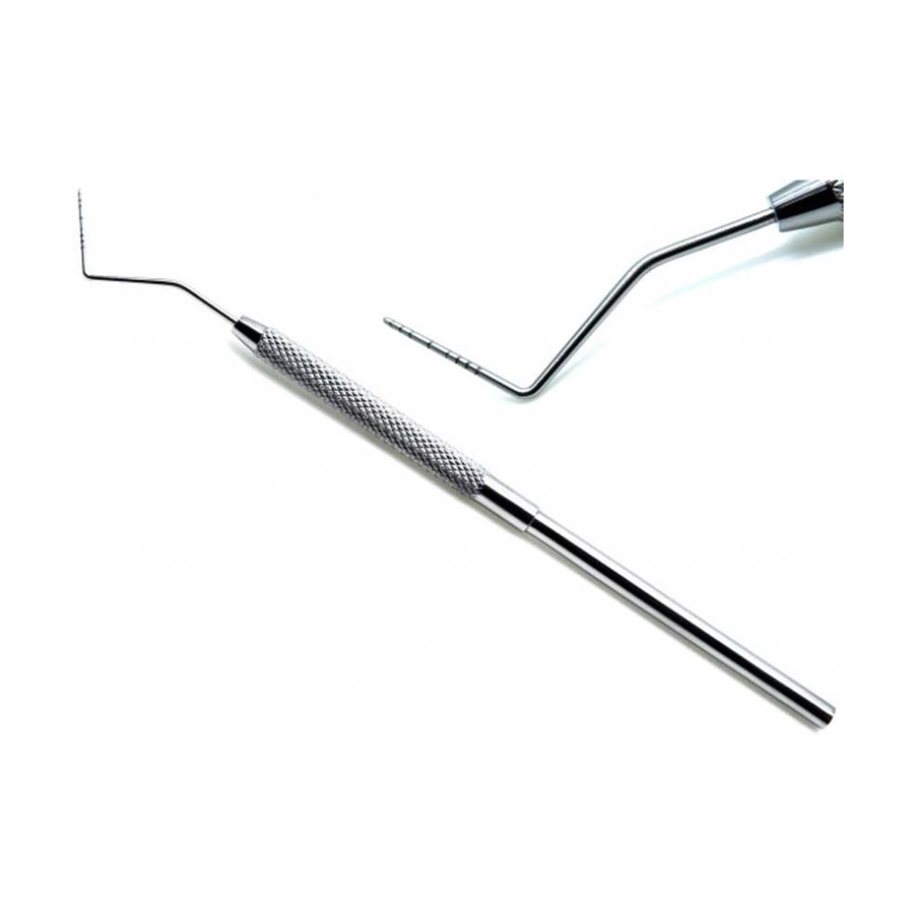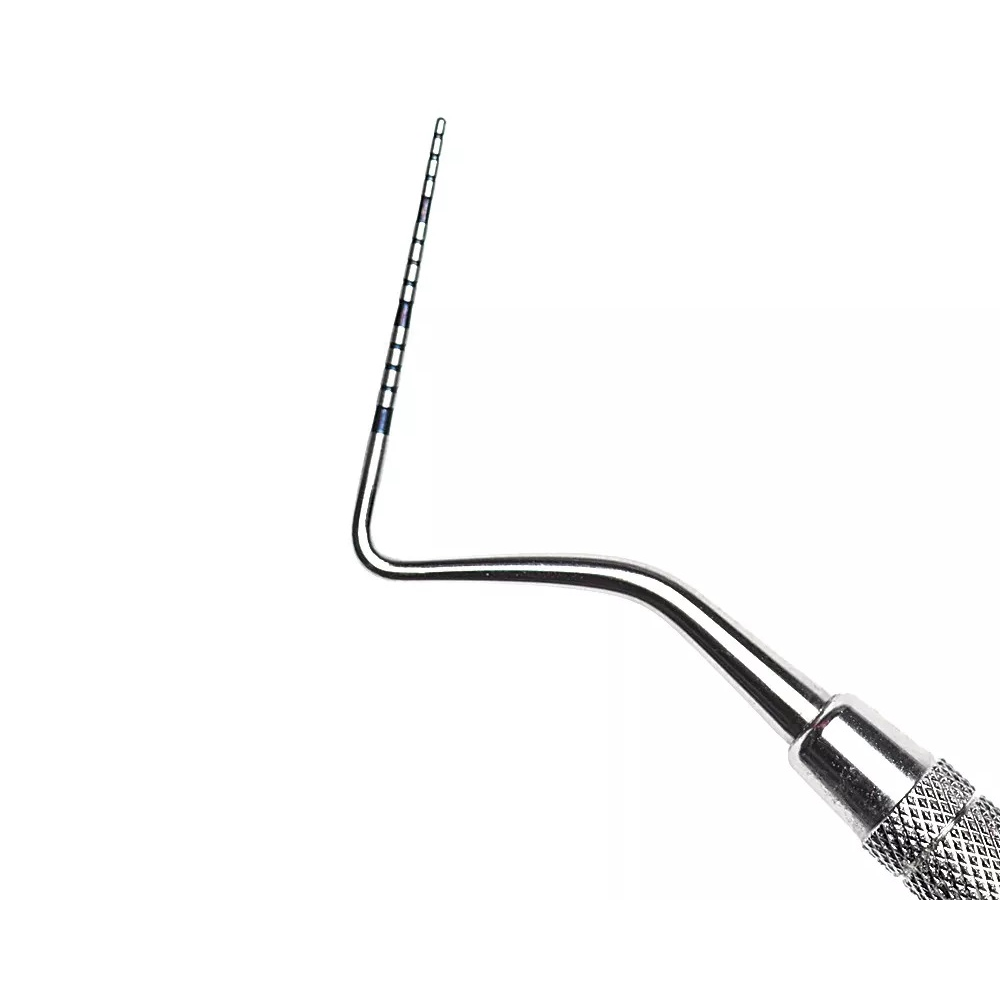 Зонд пародонтологический градуированный шариковый предназначен для проведения обследования зубов: глубина пародонтальных каналов, наличие зубных отложений, оценка корня зуюа и пр. Представляет собой прямую рукоятку с изогнутой рабочей частью с нанесённой на неё разметкой шагом 1,0 мм (длина разметки 15 мм).