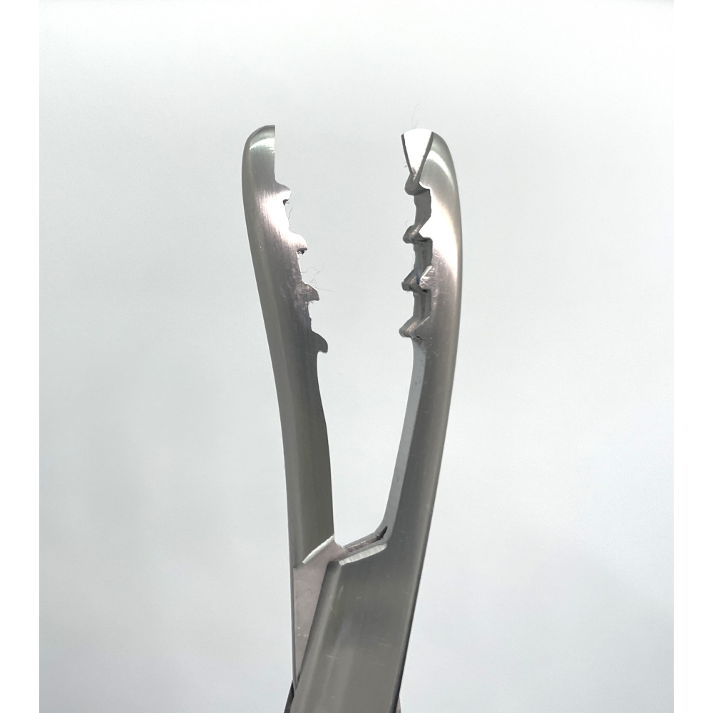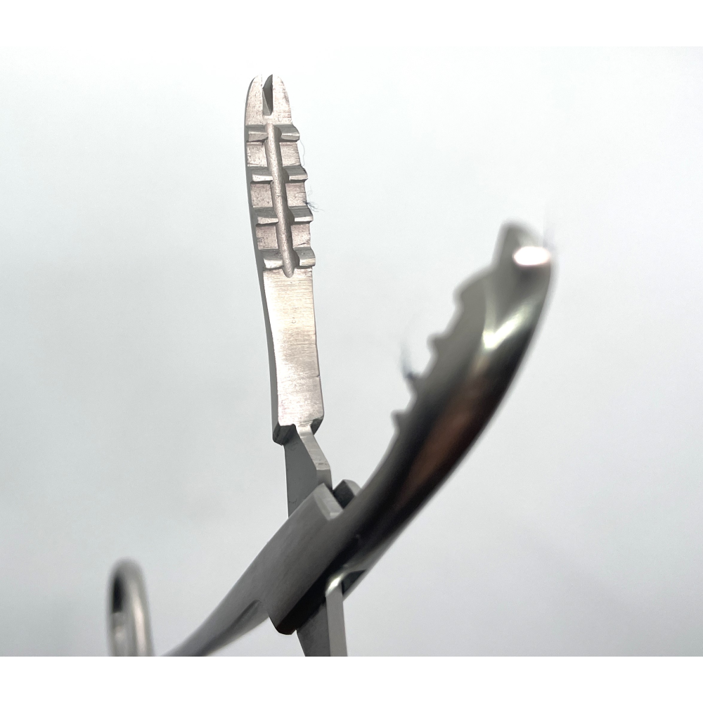 Рабочая часть изогнута по ребру, на браншах по два ряда острых зубов для надёжного захвата и центральная бороздка.